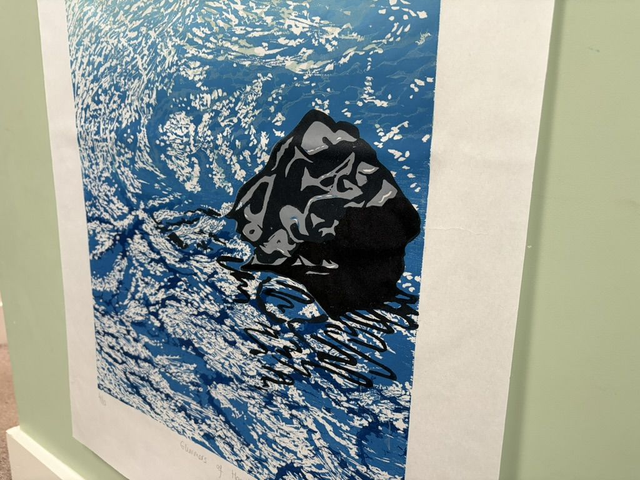 Glimmers of Hope is my largest print to date. The large scale was important to capture the movement of the sea, swirling between the rocks and sparkling on to the horizon. It is a print that has been a long time in the making, as I grappled with the colours which would best draw out the qualities of light playing on water that I wanted to capture. I love that feeling of joyful surprise that comes the first time I pull a print to reveal the image as it had always needed to be: this time it just took me a long time to find it.